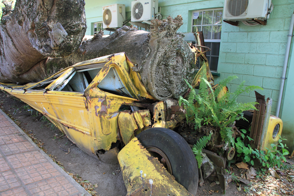Schreibe die erste Bewertung zu “Wandbild Technik kaputtes gelbes Auto unter Baumstamm”